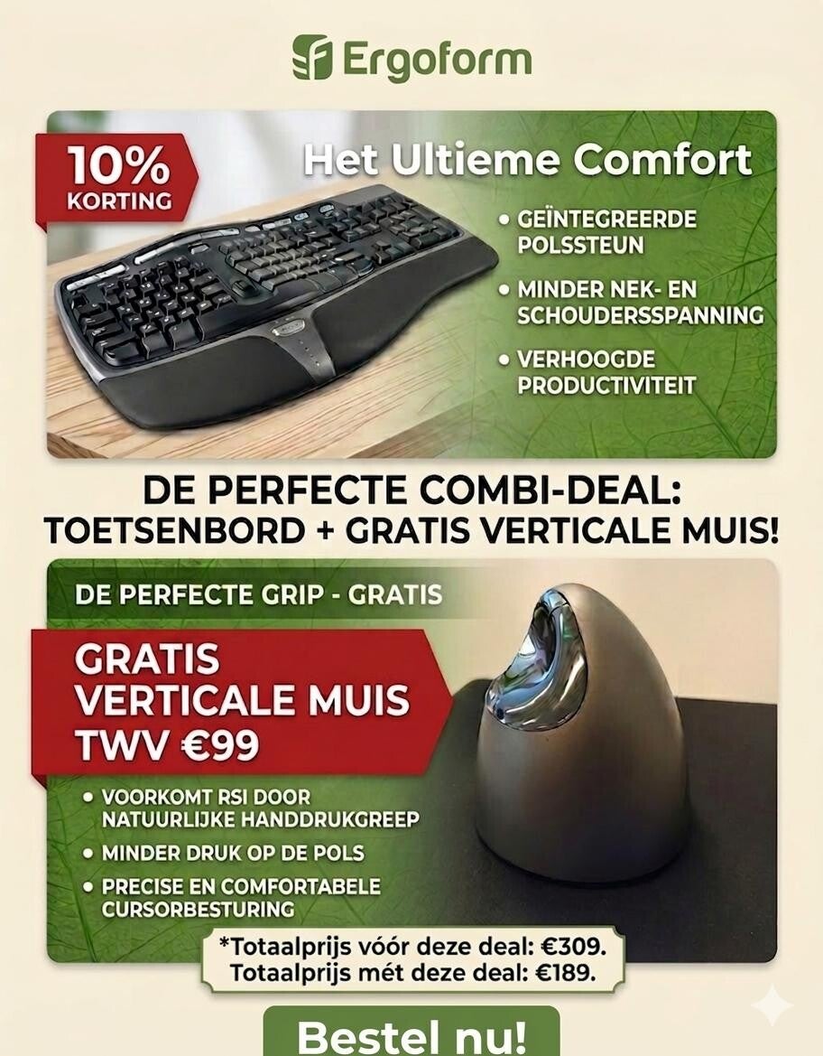 Bij elke aankoop van een ergonomisch toetsenbord: 10% korting + gratis verticale muis TWV €99!